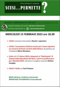 “Scusi… Permette?” la rubrica di attualità condotta da Pino Simplicio negli studi di Radio Cammarata, mercoledì 15 febbraio, ore 18:00 propone una intervista al vicesindaco Rosario Lapunzina; l’intervento del giornalista Mario Macaluso, presidente della associazione siciliana musica per l’uomo che organizza un concorso di poesie sul tema della musica; una intervista al consigluere nazionale Stefano Castiglia, l’1 marzo si disputerà a Catania la partita Italia – Macedonia del Nord per i mondiali 2024 di calcio a 5; ed infine Toti D’Antoni con fisco e tasse.