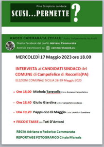 MERCOLEDÌ 17 Maggio 2023 ore 18.00, “Scusi… Permette?” la rubrica di attualità condotta da Pino Simplicio, negli studi di Radio Cammarata, affronta questi argomenti: