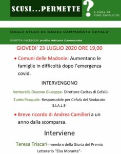 Dagli studi di Radio Cammarata con diretta facebook – profilo Adriano Cammarata – giovedì 23 luglio 2020, ore 19:00, il programma: Scusi… Permette?, a cura di Pino Simplicio, si occupa dei seguenti argomenti: