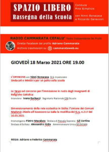 GIOVEDÌ 18 Marzo 2021 ORE 19.00 dagli studi di Radio Cammarata, Pino Simplicio conduce “Spazio Libero” rassegna settimanale della scuola. Gli argomenti: