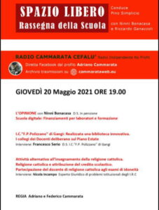 GIOVEDÌ 20 maggio 2021 ORE 19.00 dagli studi di Radio Cammarata, Pino Simplicio conduce “Spazio Libero” rassegna settimanale della scuola.